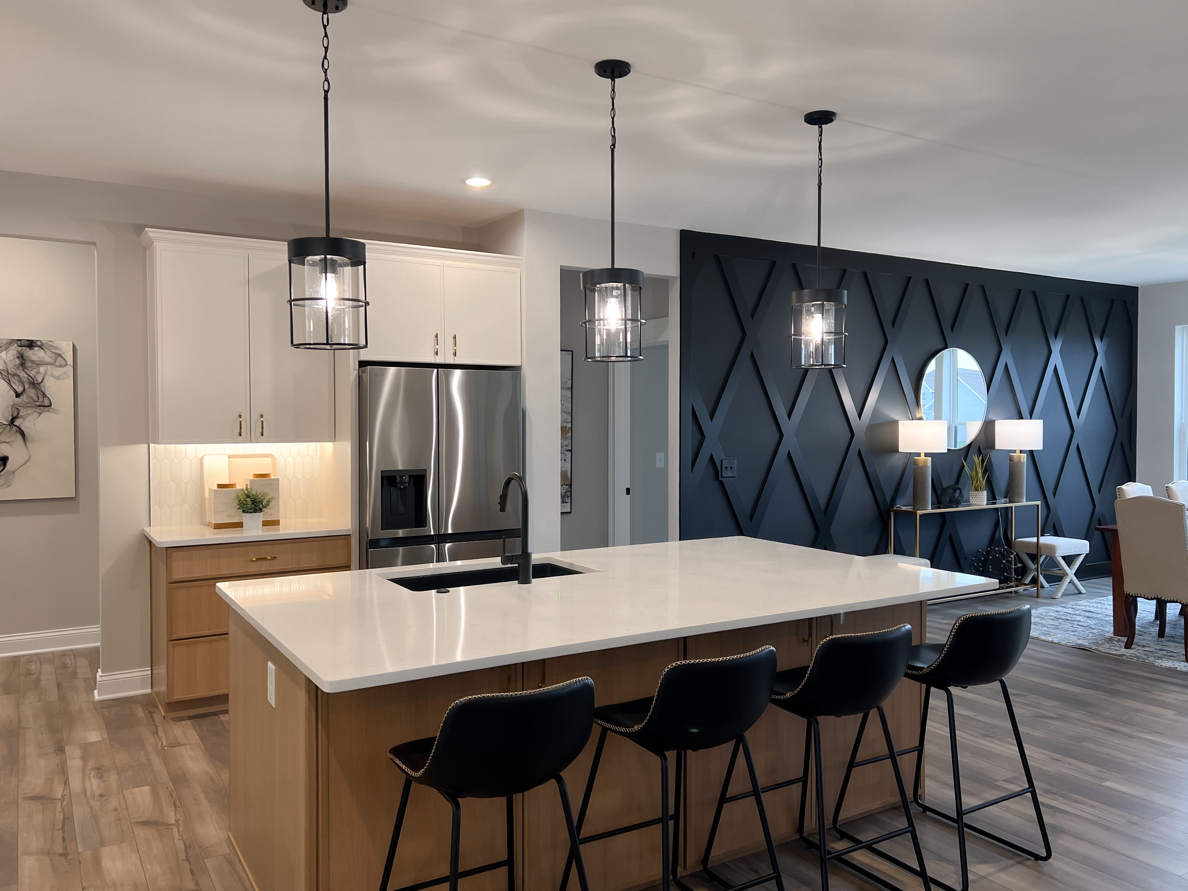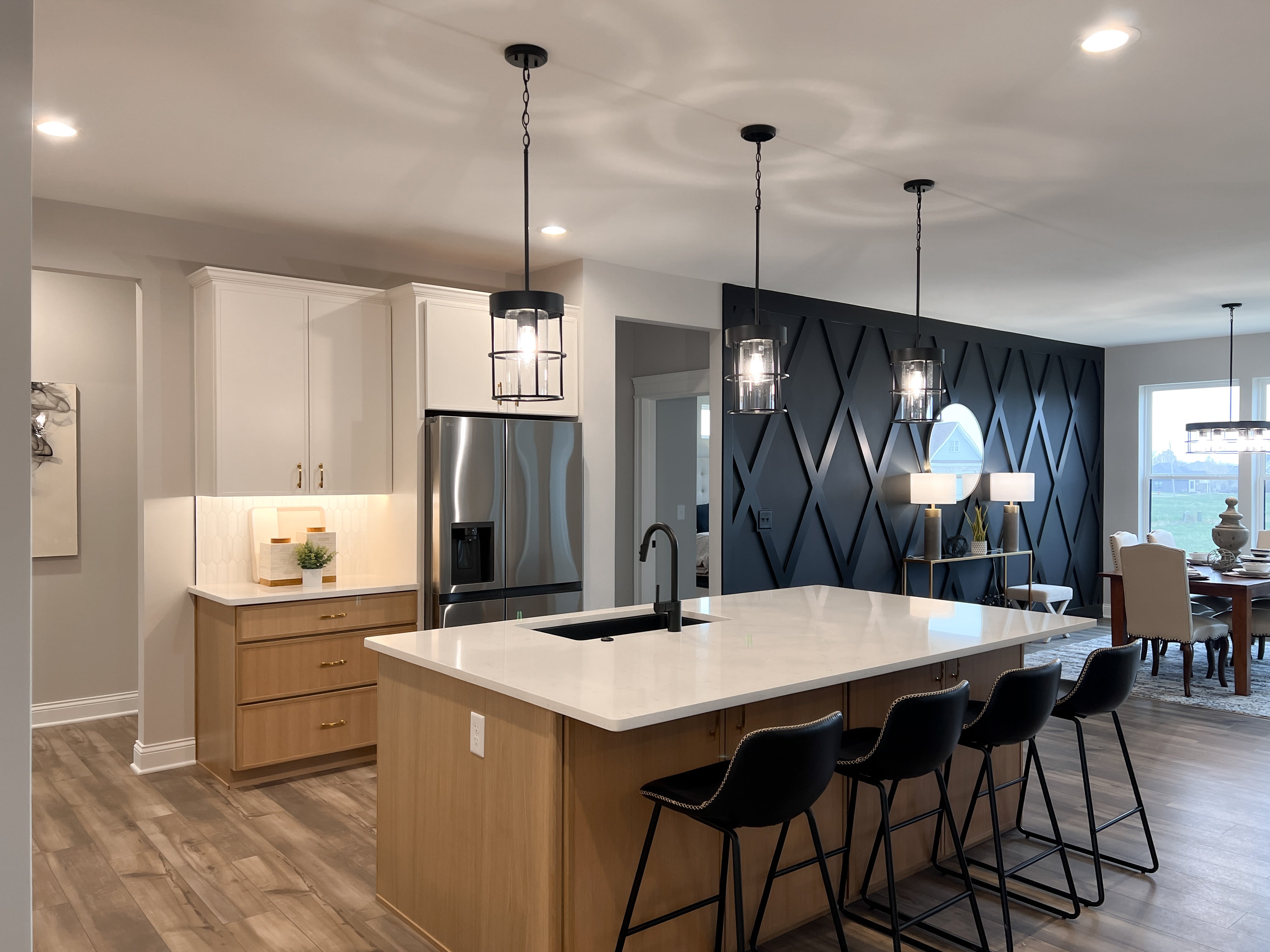 eat-in-kitchen features a large, angled island with a spacious breakfast bar overlooking