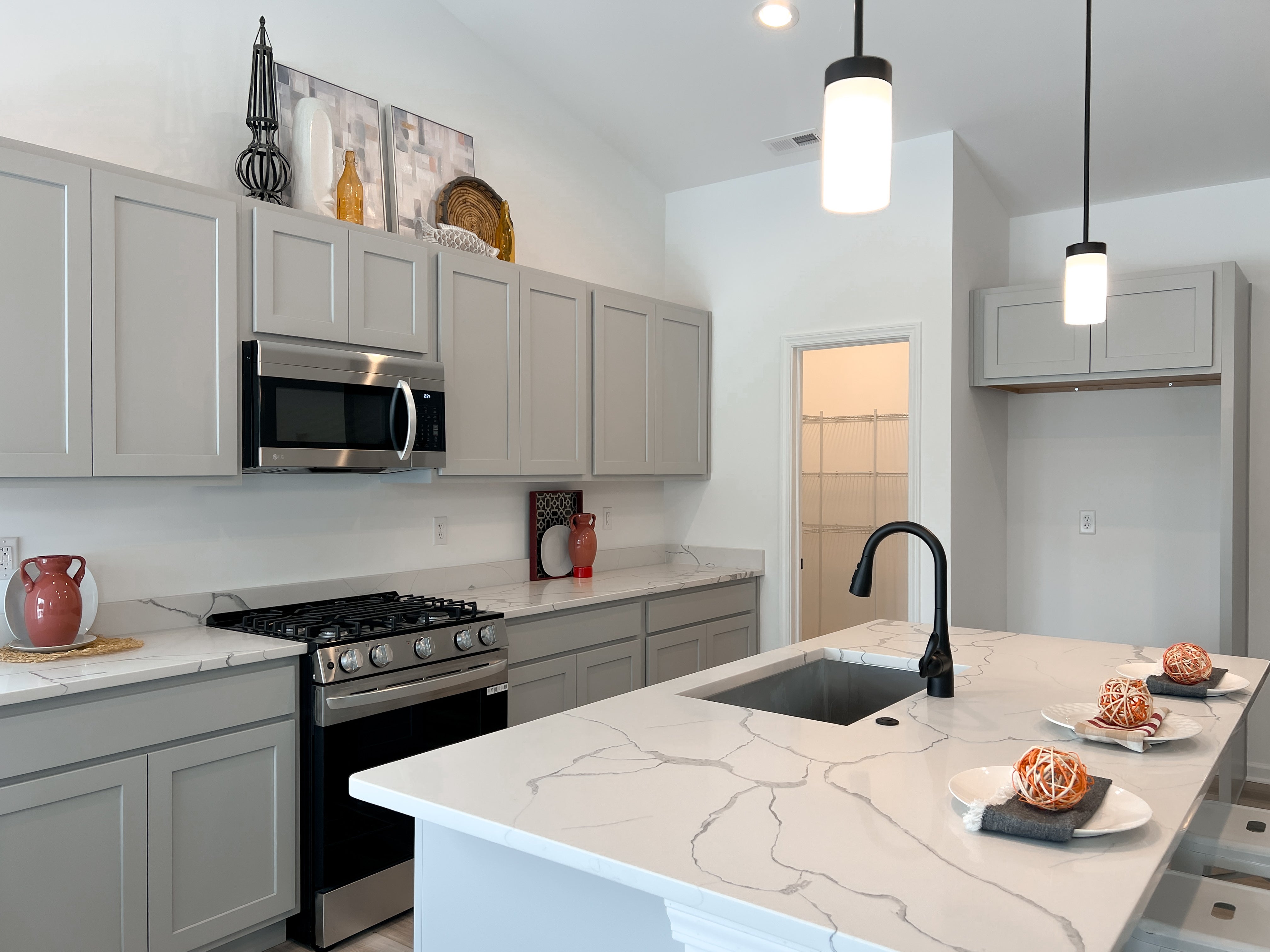 Continue down the hall, and the home opens up into a bright and airy kitchen, seamlessly flowing into the great room and dining area. Soaring 9-foot vaulted ceilings enhance the open feel, while an optional gourmet kitchen layout adds a touch of luxury for those who love to cook and entertain.