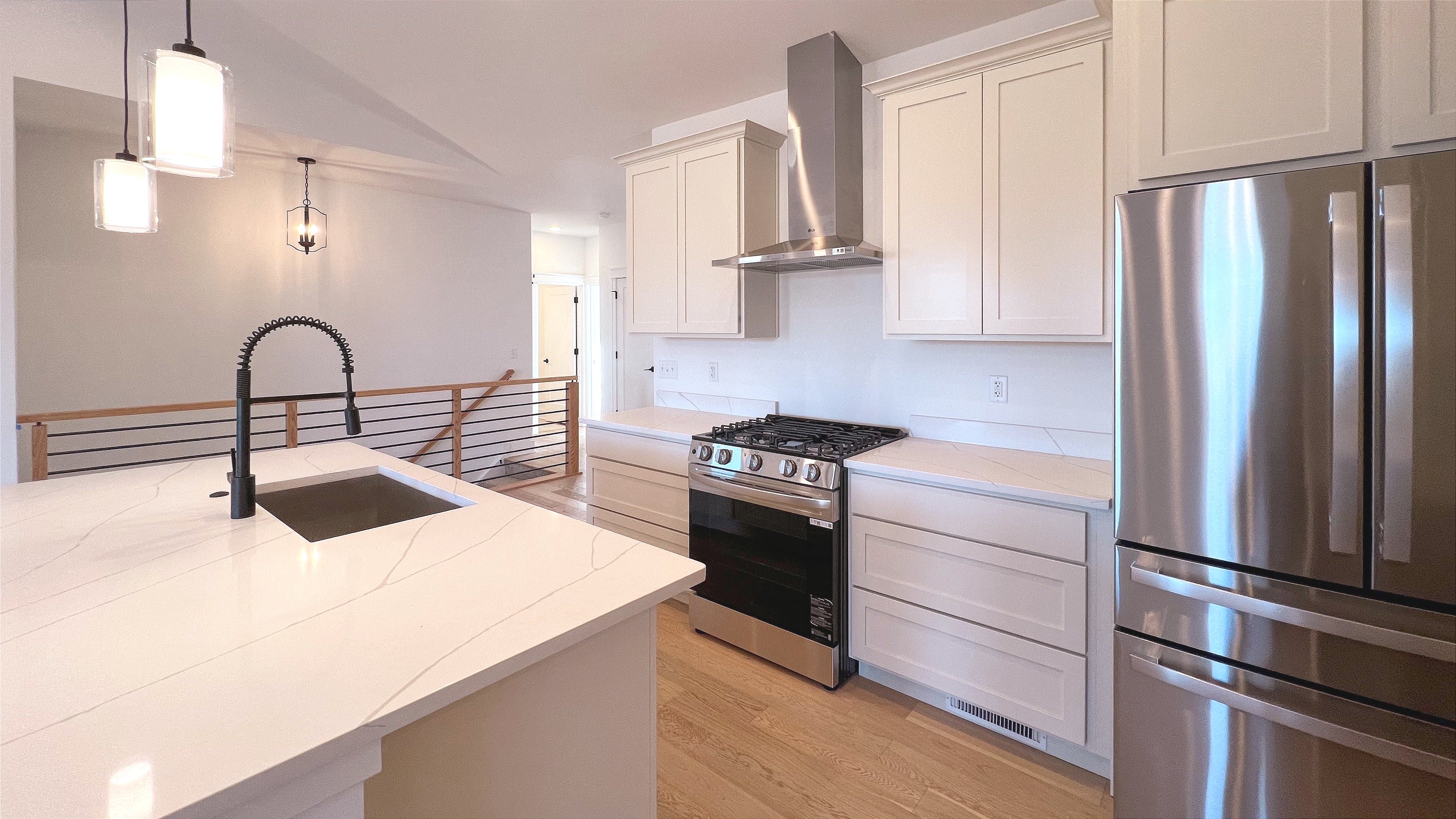 The heart of the home features an open-concept kitchen, great room, and dining area—perfect for everyday living or hosting loved ones. The kitchen, complete with ample counter space and a luxurious feel, flows seamlessly into the great room, creating a spacious yet cozy area for gathering. The dining area is ideal for meals big or small, with plenty of room for a table that fits everyone.