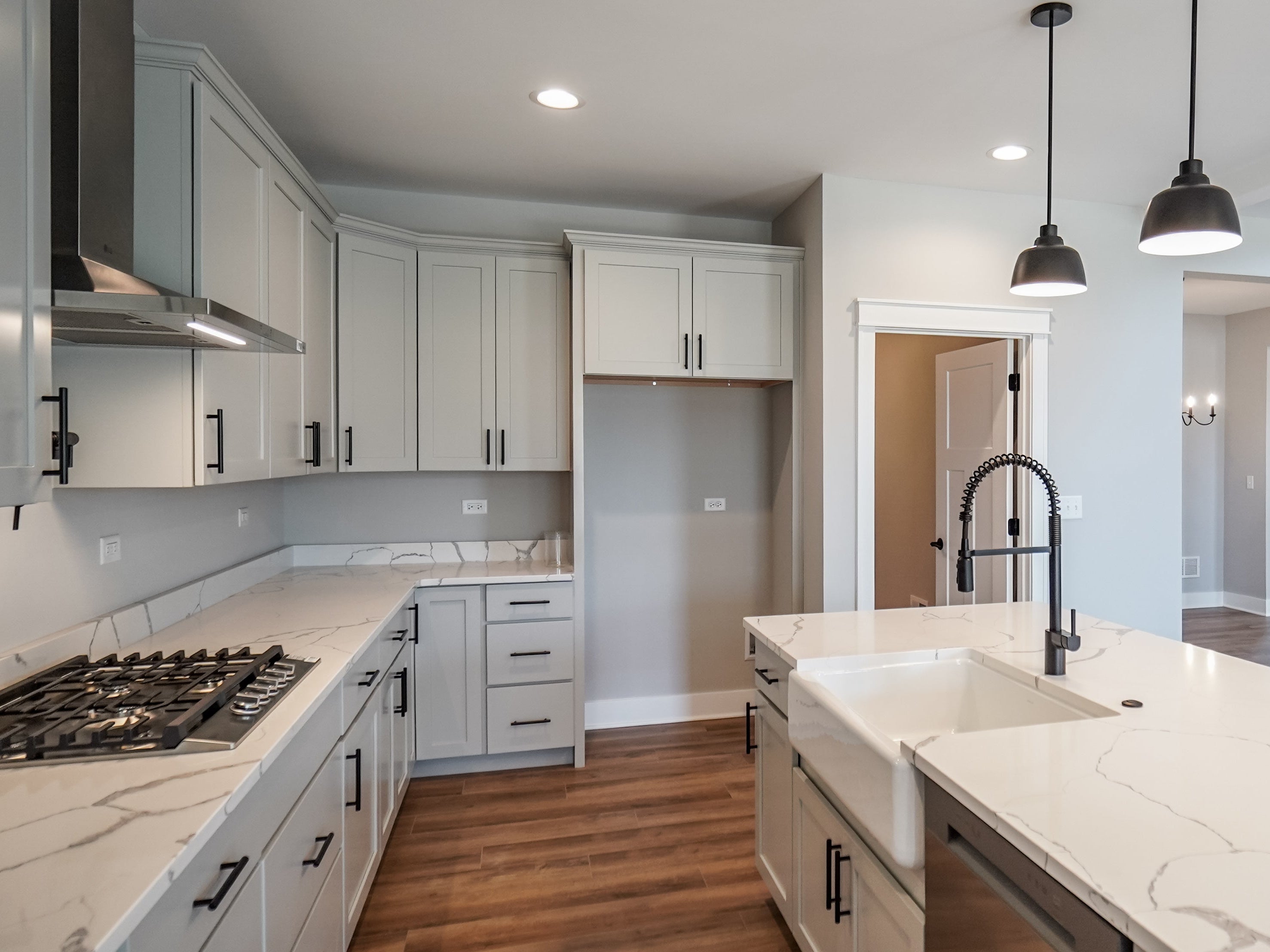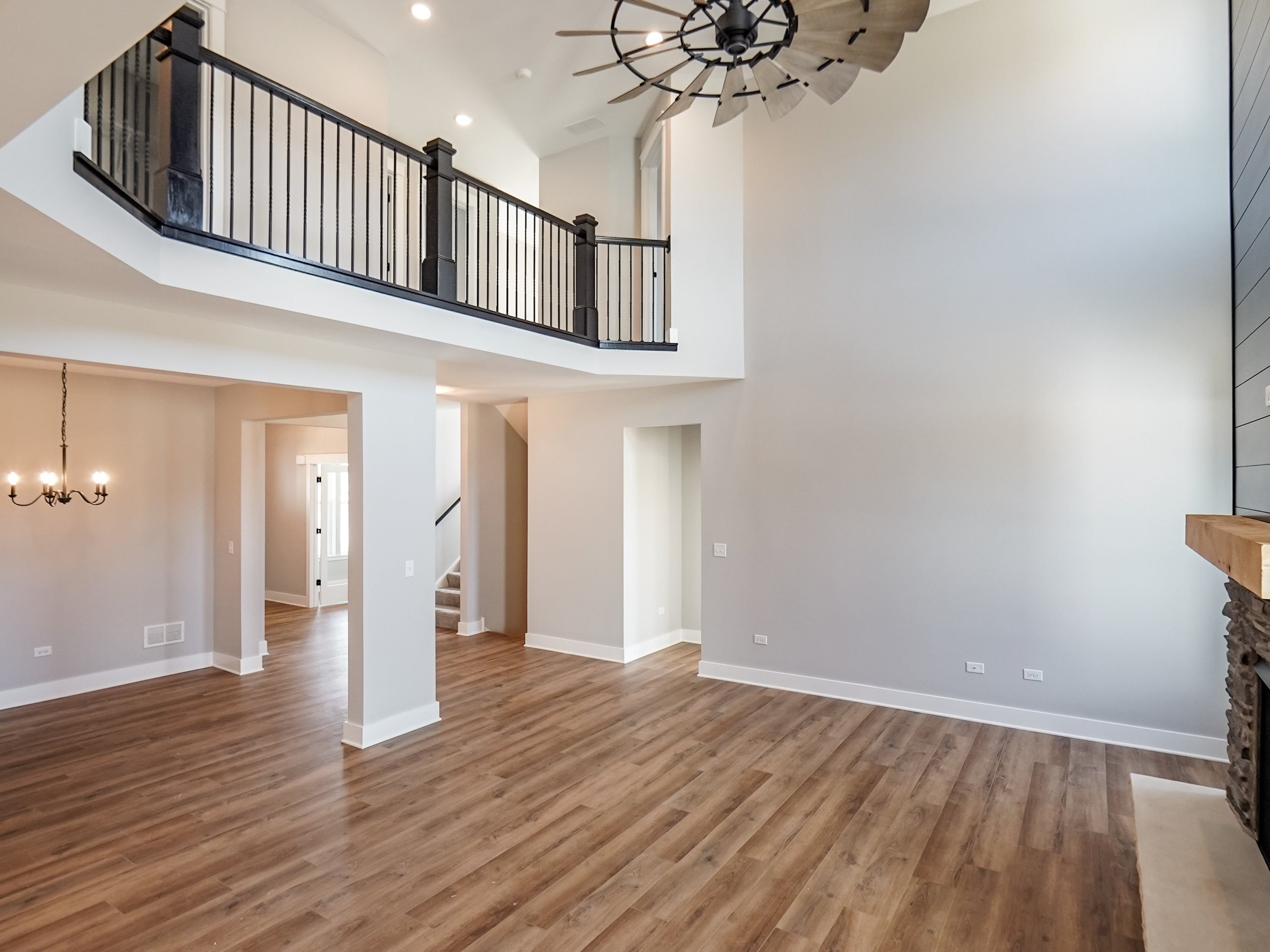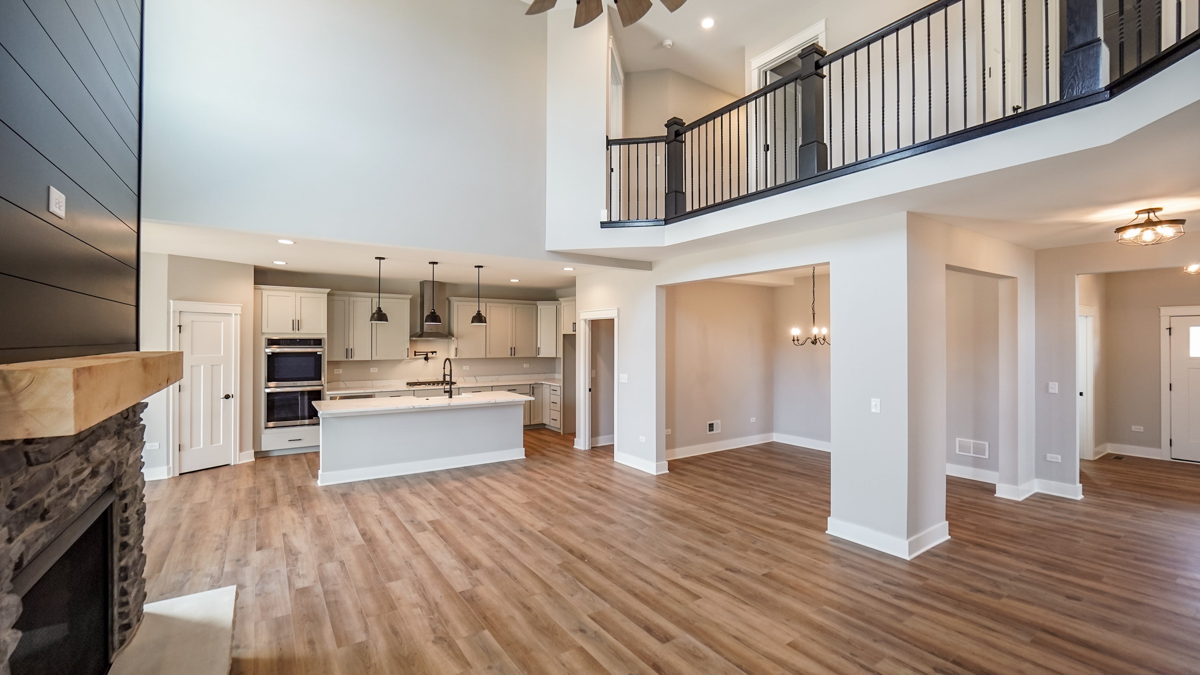 As you step through the front door, an elegant foyer welcomes you, flanked by a formal flex room on one side and a convenient powder room on the other. Continuing through the foyer, you’ll discover the heart of the home—a breathtaking two-story great room that opens to the second floor. Adjacent to the great room is a formal dining room, an ideal space for hosting intimate dinners without distraction. Afterward, unwind in the great room by the optional fireplace, which serves as a beautiful centerpiece.