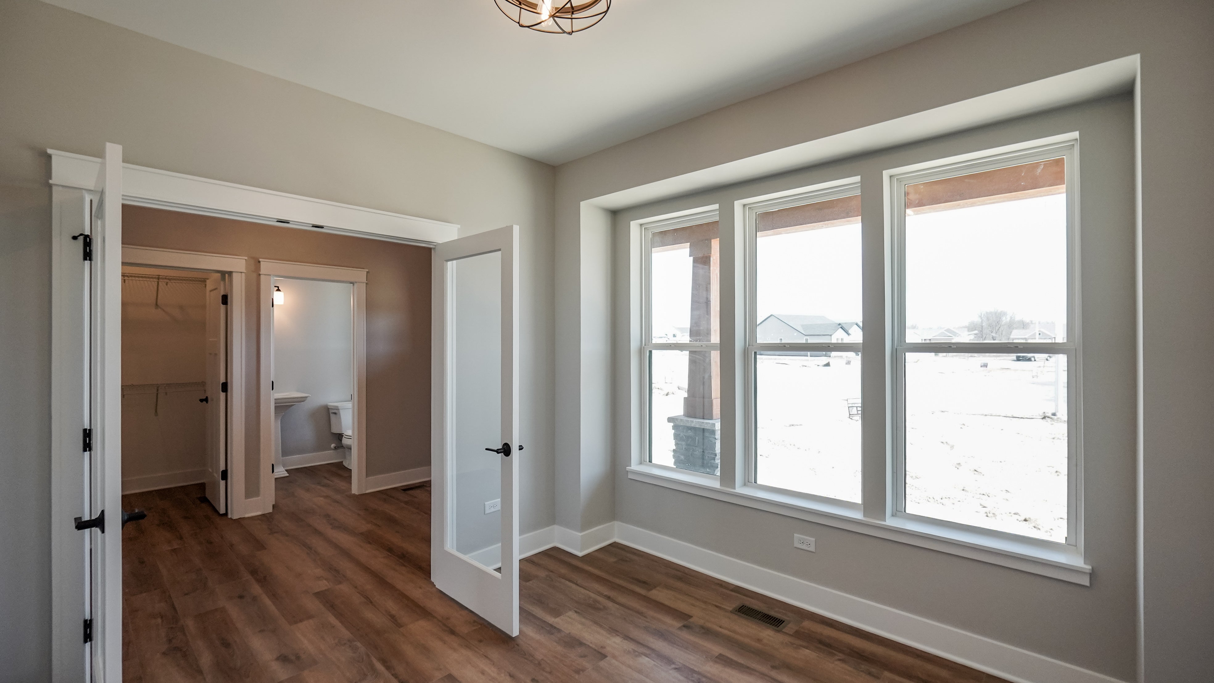 On the main floor, you’ll find the first of five bedrooms, tucked away for privacy. This space can easily adapt to your needs, whether as a guest bedroom, in-law suite, office, playroom, or more.